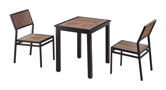 24'' x 24'' Outdoor Aluminum Table and 2 Armless Chairs Finish Black with Imitation Teak Slats