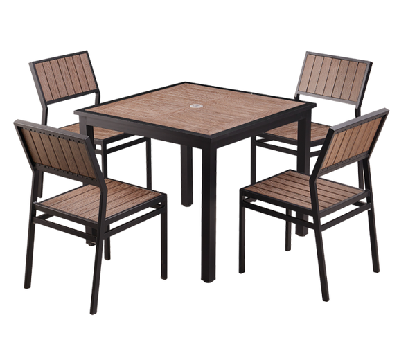 36'' x 36'' Outdoor Aluminum Table and 4 Armless Chairs Finish Black with Imitation Teak Slats