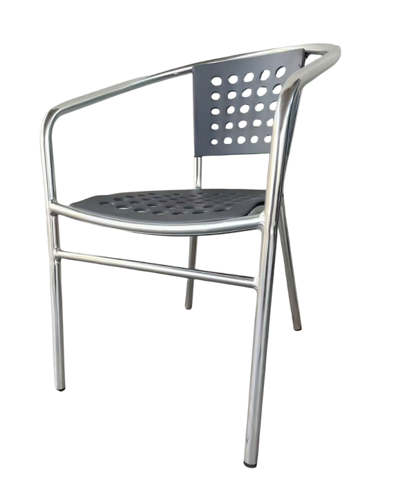 This aluminum arm chair features a sleek silver finish and is designed for outdoor use. Its lightweight construction ensures easy mobility, while the plastic seat and back offer cool comfort, making it an ideal choice for both residential and commercial patios. Durable and weather-resistant, it combines practicality with modern style.